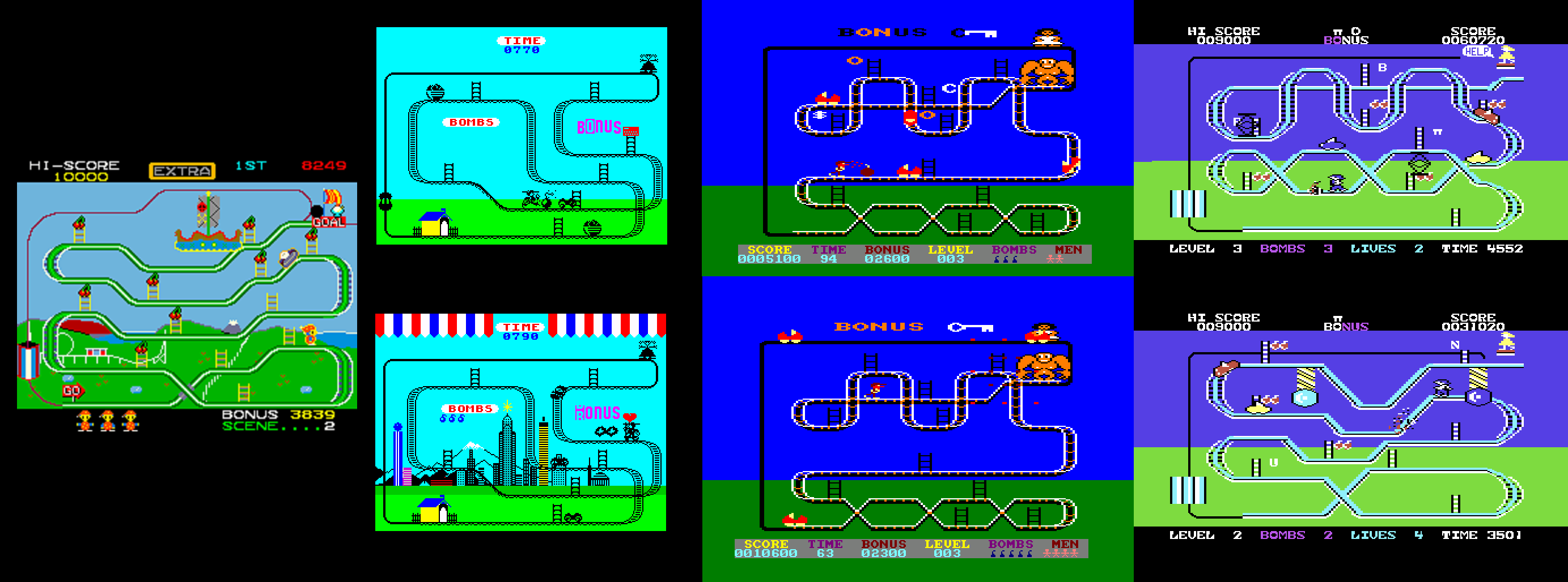 | Level 1 screens. Top left: Arcade. Top right: MSX. Bottom row, left to right: ZX Spectrum, Amstrad CPC, Commodore 64. |